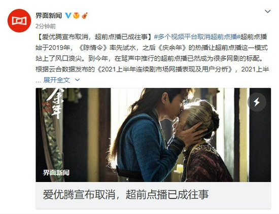 10月4日中午,爱奇艺宣布正式取消剧集超前点播,同时取消会员可见的内容宣传贴片。随后,腾讯视频和优酷也各自在官方微博上发布声明称,即日起将取消剧集超前点播服务。