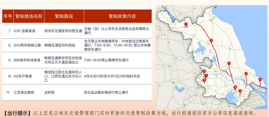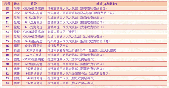 临时关闭:京沪高速淮安、淮安东,长深高速淮安机场,沪武高速凤凰至常熟,阜溧高速阜宁至建湖西,新扬高速双沟、管仲、陈集、刘集收费站入口。