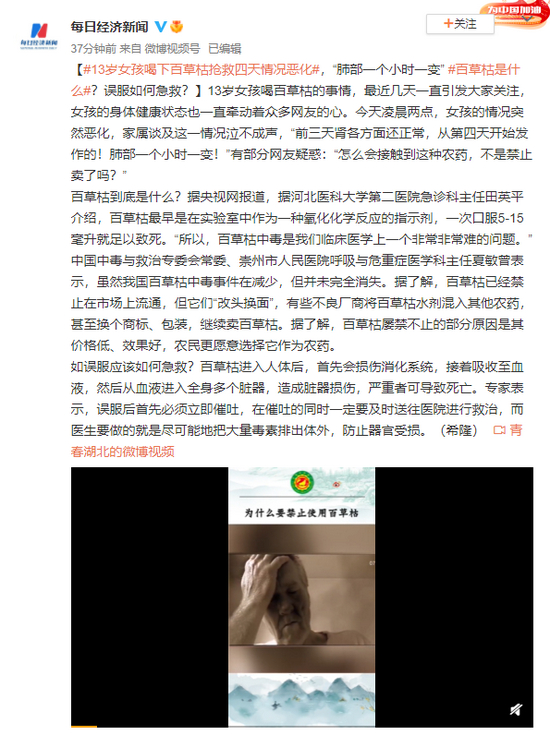 13岁女孩喝下百草枯抢救四天情况恶化,百草枯是什么?误服如何急救?