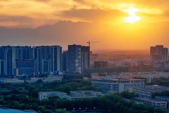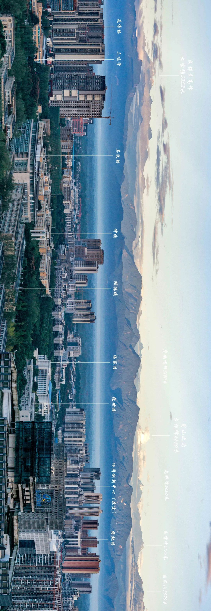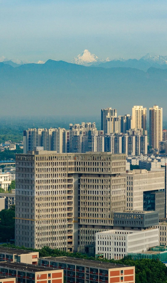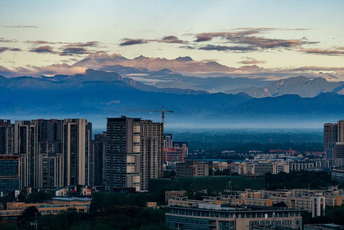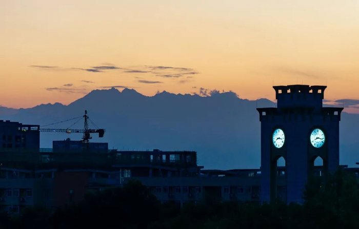 ▲夕阳校园与西岭雪山剪影