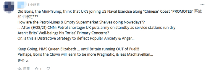 对于“中央社”的报道,有岛内网友用英文发文质问,“约翰逊(英国首相)有没有想过英国参加美国海军在中国‘沿岸’的演习是否促进区域稳定?(英国的)汽油管线和空超市货架现在怎么样了?……英国人的福祉不是保守党的关注点吗?或者,这是一种转移(英国)大众焦虑和愤怒的分散注意力的策略吗?继续前进,伊丽莎白女王号……直到英国耗尽燃料!……”