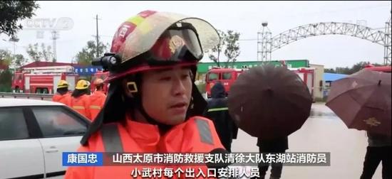 山西太原市消防救援支队清徐大队东湖站消防员 康国忠:村里靠上游的地方,水有一米深,小武村每个出入口安排人员,防止疏散转移的人员在中途返回。另一方面,周边受灾村庄有好多老人小孩被困,我们随时出动准备救援。