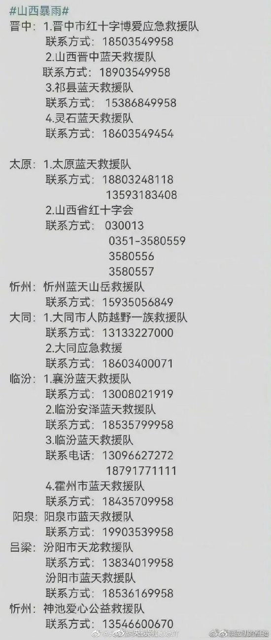 下图为灾情各地救援互助联系方式,方便开展救援工作。此外,如有网友发现图中救援电话有误请第一时间留言告知。