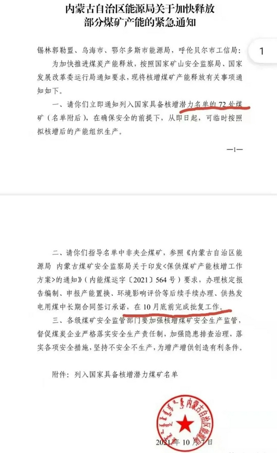 10月7日晚间,一份落款时间为10月7日的“内蒙古自治区能源局关于加快释放部分煤矿产能的紧急通知”刷屏,通知要求锡林郭勒盟、乌海市、鄂尔多斯市能源局以及呼伦贝尔市工信局,立即通知列入国家具备核增潜力名单的72处煤矿,在确保安全的前提下,从即日起,可临时按照拟核增后的产能组织生产。