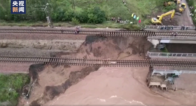 近日,山西省多地遭遇持续降雨。其中在10月6日,南同蒲铁路祁县至东观间昌源河大桥桥台被冲垮,枕木悬空,影响行车。