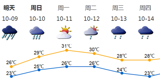 受“狮子山”外围云系影响,9日有暴雨局部大暴雨和7-9级阵风,气温23-26℃;明显风雨天气在9日夜间减弱,10日午后趋于结束。11日转晴好天气;12-14日再转多雨天气。