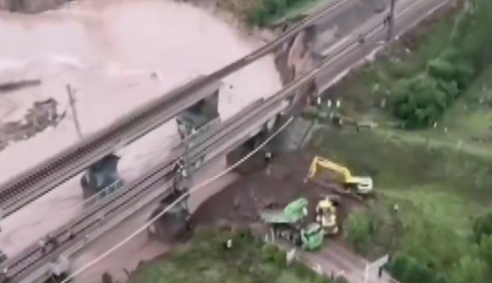 受连续降雨影响,6日,山西南同普线祁县至东观间昌源河大桥桥台被冲垮,当地部门紧急抢修。