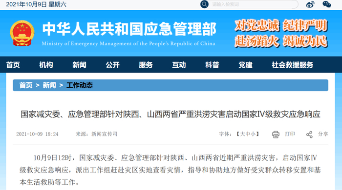 据应急管理部网站10月9日消息,今天12时,国家减灾委、应急管理部针对陕西、山西两省近期严重洪涝灾害,启动国家Ⅳ级救灾应急响应,派出工作组赶赴灾区实地查看灾情,指导和协助地方做好受灾群众转移安置和基本生活救助等工作。