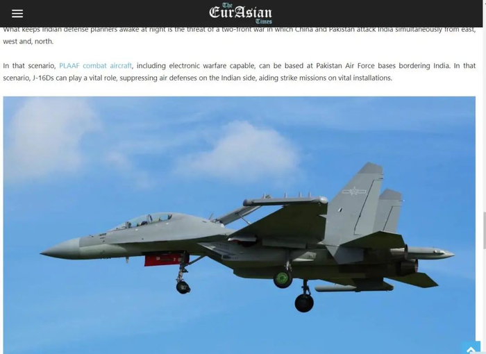 《欧亚时报》网站8日的文章有一种“伸着脑袋接石头”的感觉。一边说着中国电子战飞机歼-16D在台湾附近被发现,另一方面则借着专家之口说“印度边境可能是下一个(部署地)”。
