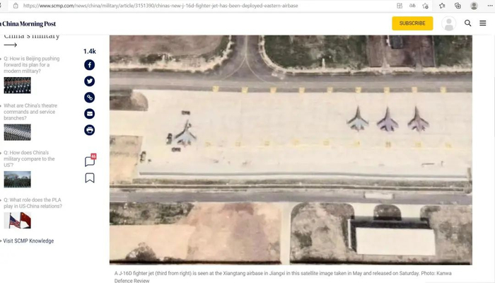 但加拿大的《汉和防务评论》(Kanwa Defense Review)上周六发布的卫星图像宣称,一架歼-16D被部署在位于江西的一个空军基地。汉和主编平可夫宣称,卫星图像显示歼-16D已于5月部署到江西南昌的一个空军基地。港媒的报道称,一张卫星图像显示解放军空军基地的机库,可以容纳歼-16D等先进的战斗机。