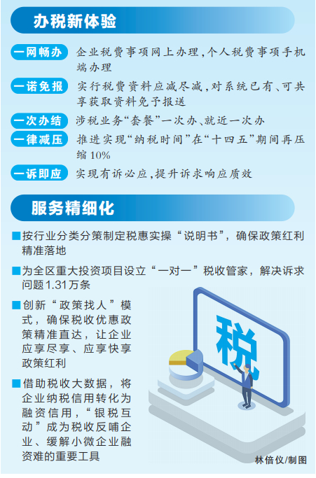 改革提升新体验:“一网畅办”,企业税费事项网上办理,个人税费事项手机端办理;“一诺免报”,实行税费资料应减尽减,对系统已有、可共享获取资料免予报送;“一次办结”,涉税业务“套餐”一次办、就近一次办;“一律减压”,推进实现“纳税时间”在“十四五”期间再压缩10%;“一诉即应”,实现有诉必应,提升诉求响应质效。