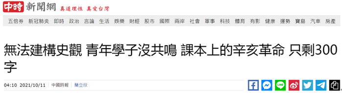台湾“中时新闻网”消息,在“去中国化”氛围下,很多青年学子只把“双十”当作“生日”,甚至和台湾光复节混为一谈,浑然忘了这一天是辛亥革命110周年。台湾嘉义大学教授吴昆财表示,60年前初中历史课本中有多达6000字叙述辛亥革命,现在仅300多字,比一则新闻简讯还短,没有历史脉络,人物也只剩一个孙中山,“如此简略、模糊的文本叫青年学子如何掌握史实,进而评论革命的意义?”