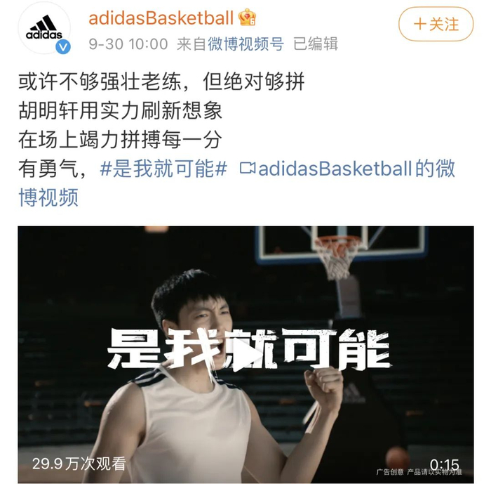 而胡明轩的微博在转发代言博文后就停止了更新,也没有转发阿迪达斯在9月30日发布的另一则宣传视频。