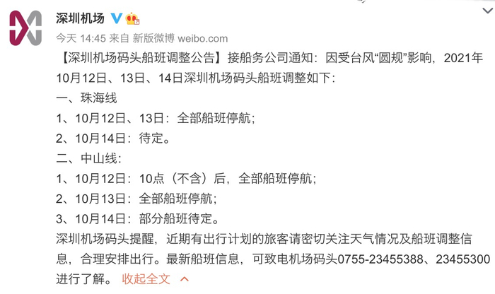 12日下午,深圳机场码头船班调整公告,接船务公司通知:因受台风“圆规”影响,2021年10月12日、13日、14日深圳机场码头船班调整如下:
