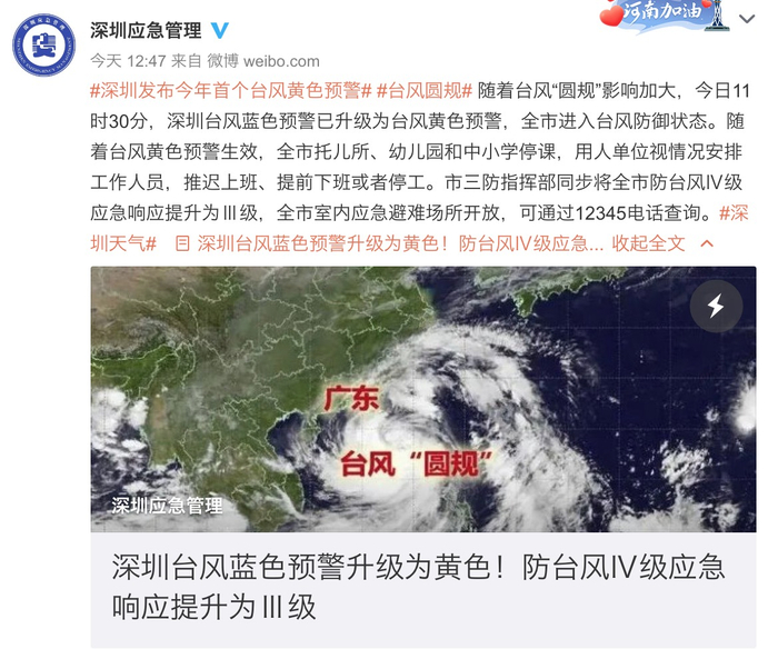 12日晚间,深圳市气象台特别提醒,据深圳市教育局《台风暴雨高级别预警分时段学校防御指引(2017年修订版)》相关规定:台风黄色预警信号在6:30前发布,全市中小学、幼儿园全日停课。目前预计台风黄色预警信号将持续至13日中午前后。若有变化,深圳市气象台将于明天6:30前根据实况进一步研判,请大家及时关注我台发布的最新预警预报信息。