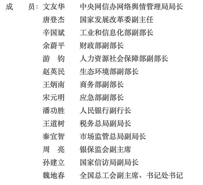 成员共14人,分别来自中央网信办、国家发改委、工信部、财政部、人社部、生态环境部、商务部、应急部、央行、税务总局、市场监管总局、银保监会、国家信访局和全国总工会。