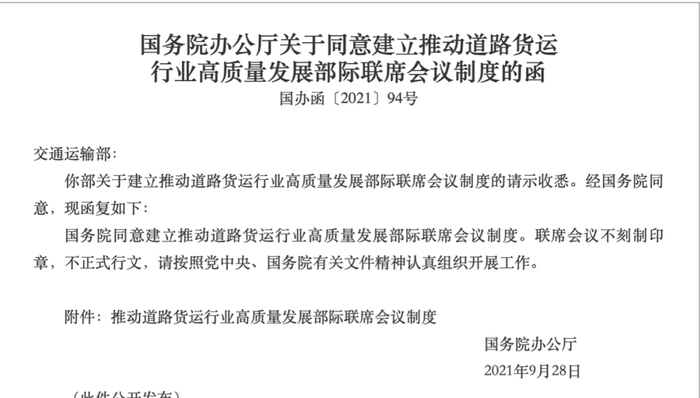 函件中提到,国务院同意建立“推动道路货运行业高质量发展部际联席会议制度”。
