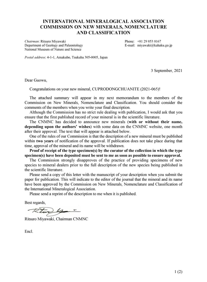 来源:中国地质大学北京近日,我校科学研究院晶体结构实验室李国武教授团队发现的两种新矿物,经国际矿物学协会新矿物命名及分类委员会(IMA-CNMNC)高票通过,获得正式批准(批准号:IMA2021-058、IMA2021-065)。
