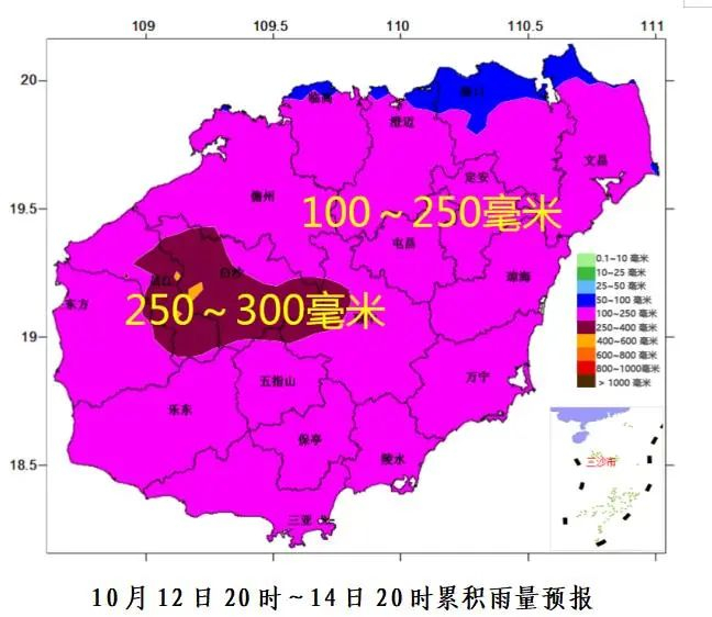 10月12日20时~14日20时,全岛有暴雨到大暴雨、其中中部和西部局地特大暴雨。