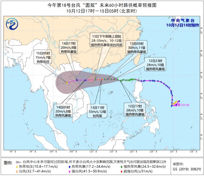预计,“圆规”将以每小时25-30公里的速度向偏西方向移动,强度还将有所加强,将于13日下午到晚上在海南文昌到三亚一带沿海登陆,登陆强度为强热带风暴级或台风级(10-12级,28-33米/秒)。