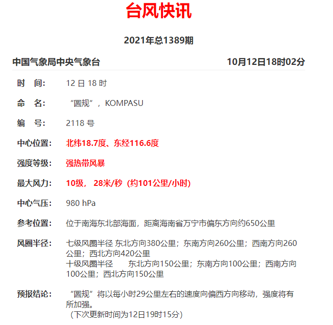 记者从气象部门了解到,“圆规”的中心10月12日下午5点钟位于海南省万宁市偏东方约660公里的南海东北部海面上(北纬18.7度,东经116.7度),中心附近最大风力为10级(28米/秒),中心最低气压为980百帕,七级风圈半径为260-420公里,十级风圈半径为100-150公里。