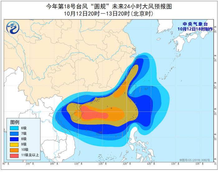 “圆规”中心经过的附近海面风力11-12级,阵风13-14级;