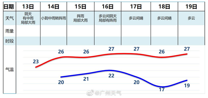 14日:阴天,有小到中雨转阵雨,20~27℃;