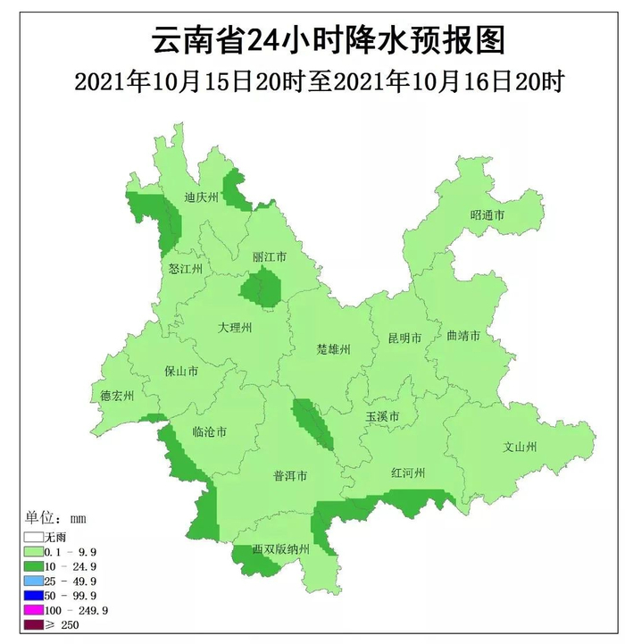 10月15日20时-16日20时:迪庆、丽江、怒江、大理、保山、德宏、临沧、普洱、西双版纳、红河南部多云间阴有小雨局部中雨,其它地区阴有零星小雨。