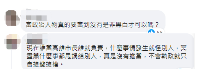 有不少网友还在张文杰帖文底下留言表示,“当政治人物真的要当到没有是非黑白才可以吗”、“现在谁当高雄市长谁就负责,什么事情发生就怪别人,冥尽党(民进党)什么事都甩锅给别人,真是没有担当,不会执政就只会抢钱抢权”。