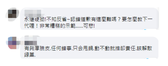 还有网友批评民进党:“永远硬拗!不知反省~认错道歉有这么难吗?要怎么教下一代喔!非常糟糕的示范……可悲!”“有够厚脸皮,任何错事,只会甩锅,动不动就推卸责任,该解散。”