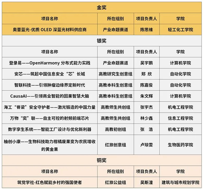 我校轻工化工学院《奥蕾蓝光—优质OLED深蓝光材料供应商》等10个项目晋级全国总决赛,9个项目入围总决赛现场比赛,入围项目总数并列全省第一,全国第八,创历史新高。经过激烈角逐,最终斩获金奖1项(该赛道仅15项金奖),银奖8项,铜奖1项。