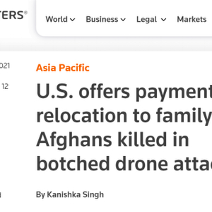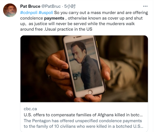 包括路透社、加拿大广播公司(CBC)等多家外媒消息,五角大楼当地时间15日宣布向美军从阿富汗撤军最后期限内一次空袭中丧生的10名平民家属提供慰问金。虽然美方没有透露具体数额,并承诺为遇难者家属提供帮助,然而果不其然,这种所谓事后“补救”的举措引起不少网友围攻,他们讽刺美方拿“封口费”平息谋杀行径,这么做是“美国的惯例”。