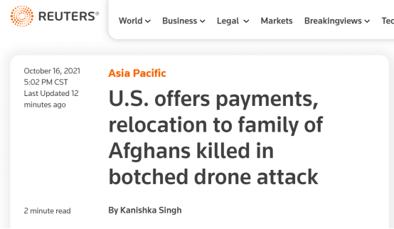 路透社:美国提供赔偿,并(承诺)重新安置在失败的无人机袭击中丧生的阿富汗人家属
