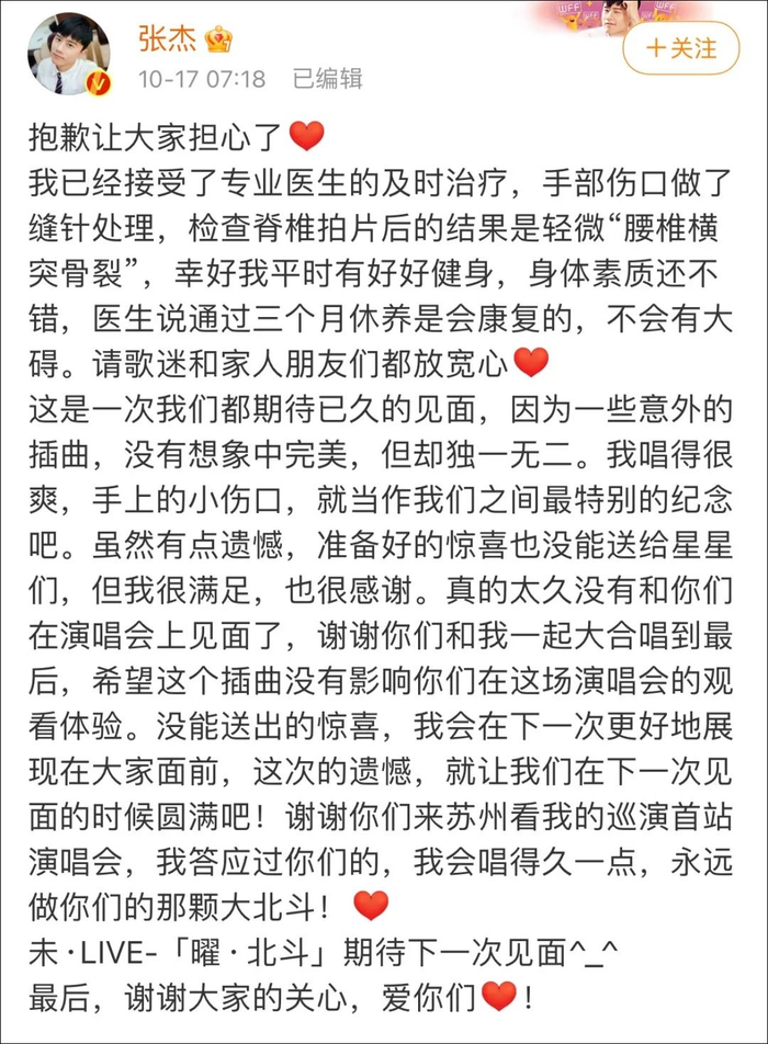 昨晚,张杰的未·LIVE—「曜·北斗」巡回演唱会在苏州举办,一段张杰因电梯事故受伤的视频随后在网络流传。
