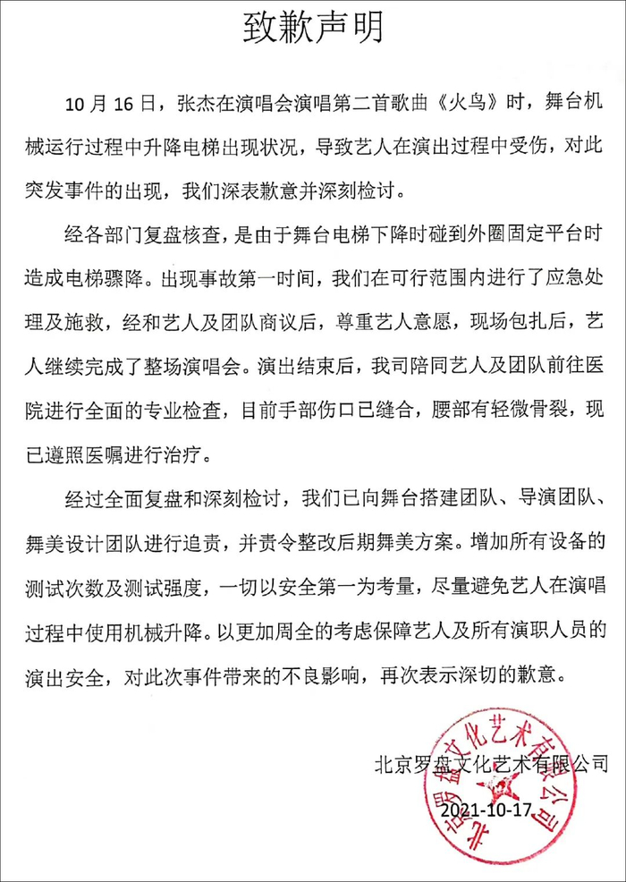 今天下午,演唱会主办方罗盘文化发布道歉声明称,事发当时,舞台机械运行过程中升降电梯出现状况,导致艺人在演出过程中受伤,对此突发事件的出现,深表歉意并深刻检讨。