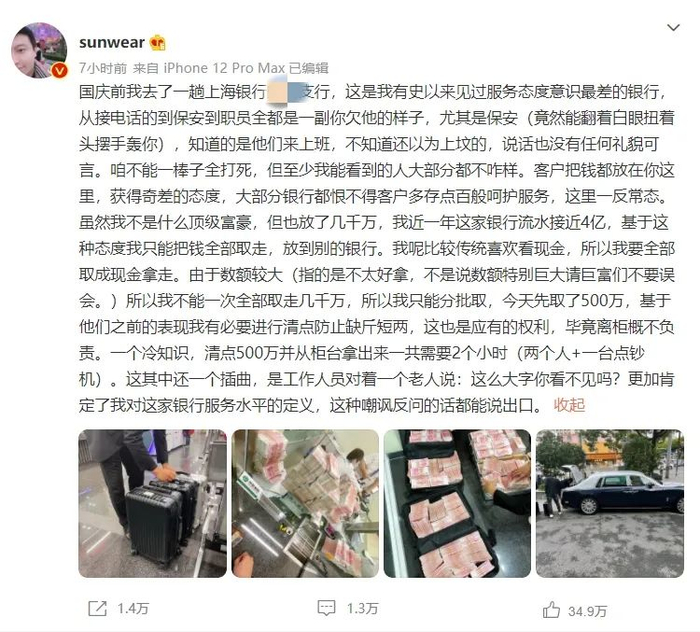 10月16日,一位认证为信息安全专家的微博大V@sunwear发文炮轰上海银行,声称由于该行服务态度不好,他准备分批将存在该行的几千万元全部取现转移,目前已取500万元带走。文中所配照片显示,所取现金搬上了一辆劳斯莱斯。