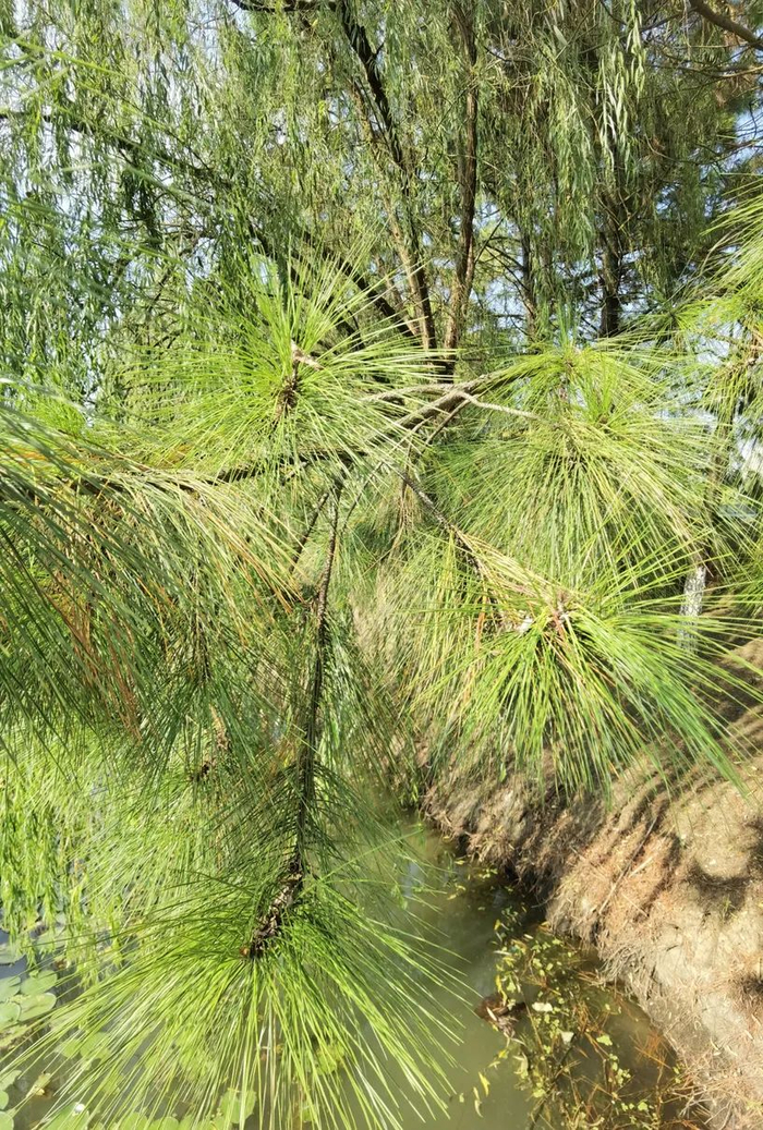 马尾松,树皮红褐色,枝平展或斜展,树冠宽塔形或伞形,枝条每年生长一轮,冬芽卵状圆柱形或圆柱形,针叶,细柔,微扭曲,两面有气孔线,边缘有细锯齿;叶鞘宿存。