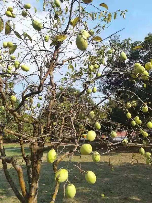 喜树高大挺拔,叶子茂密,喜树果垂在枝头,绿中透黄,好似一串迷你的小香蕉。