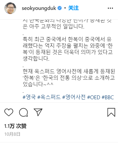 他称,新列入牛津英语词典的韩服被介绍为“韩国传统服装”,这是一项具有重大意义的里程碑,此前中国的百度一直将韩服称为“汉服”,并称其“源自中国”。