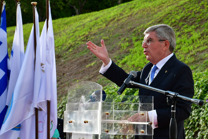 国际奥委会主席巴赫在北京冬奥会火种采集仪式上致辞。