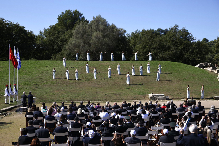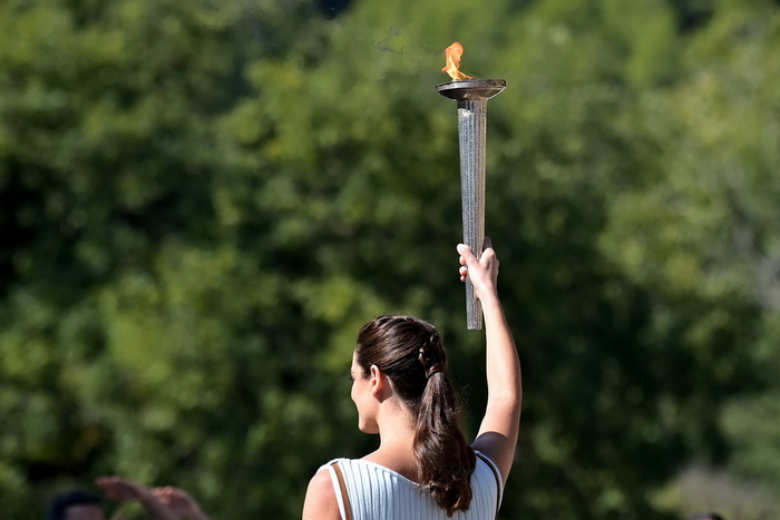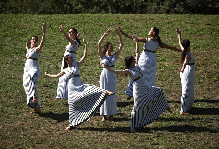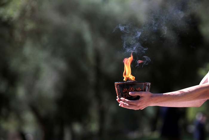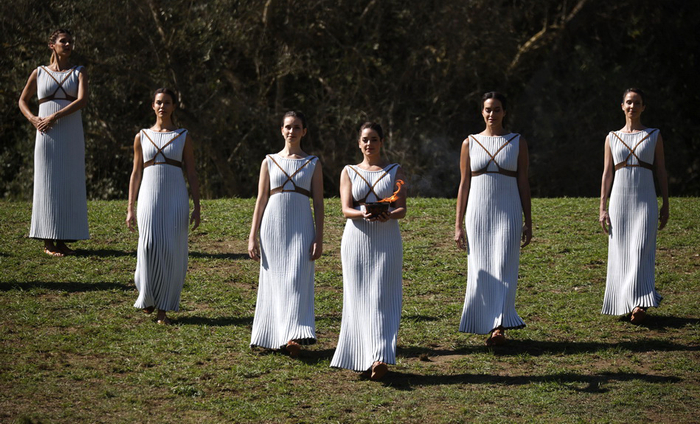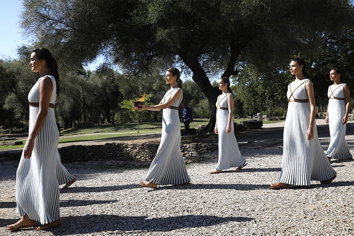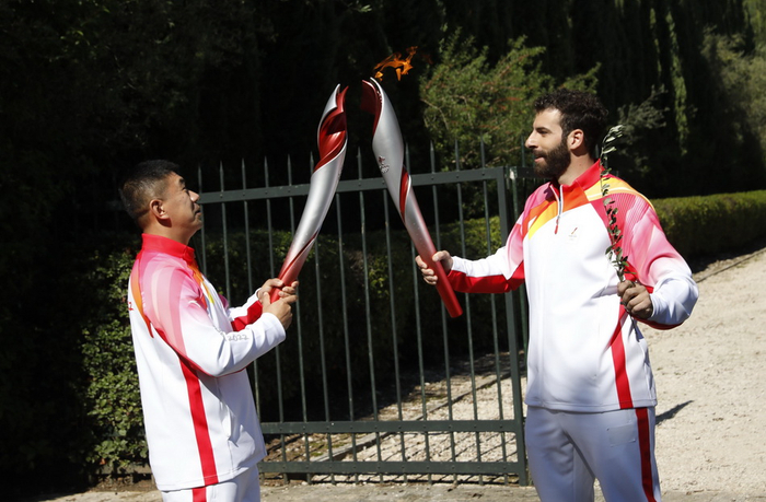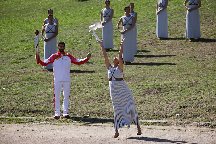 在一段舞蹈表演后,最高女祭司将燃起的火炬及象征和平与荣耀的橄榄枝传递给第一棒火炬手——希腊高山滑雪运动员扬尼斯·安东尼乌(Ioannis Antoniou)。