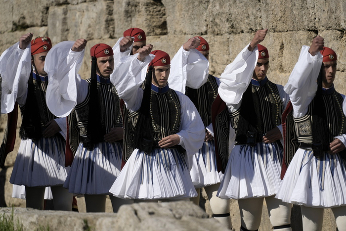 希腊总统卫队士兵在北京冬奥会圣火采集仪式上行进。