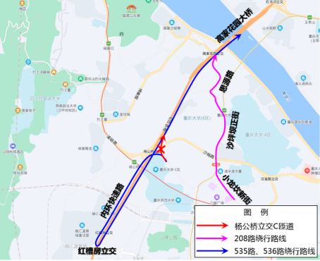 原公交535路、536路经杨公桥立交C匝道至高家花园大桥方向线路调整为:渝碚路-杨公桥立交-内环快速路-红槽房立交(调头)-内环快速路-高家花园大桥方向,站点停靠不变。返回线路及停靠站点维持现状。