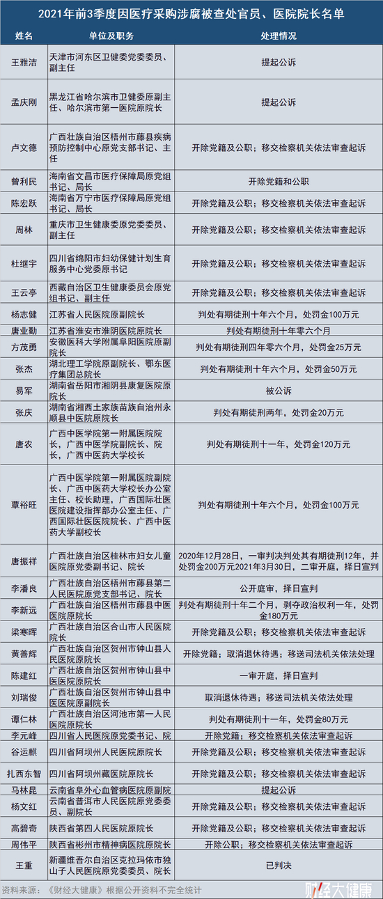 2021年前三季度,已有至少19名卫健系统的官员、60名医院院长因腐败问题受到查处。其中,近六成涉嫌受贿、权钱、权色交易,32人的腐败与医药、医疗设备采购有关。