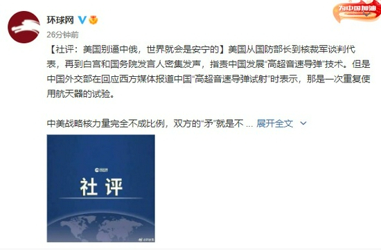 环球时报社评:美国别逼中俄 世界就会是安宁的