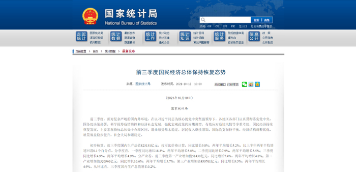 中国前三季度GDP同比增长9.8%,成绩耀眼,然而第三季度GDP同比增长4.9%,低于国内外经济学家和机构的普遍预期。第三季度增长乏力的原因被认为是缺电、国际供应链紊乱、疫情在一些地区的爆发抑制了消费、房地产市场受恒大暴雷等综合原因疲软,等等。