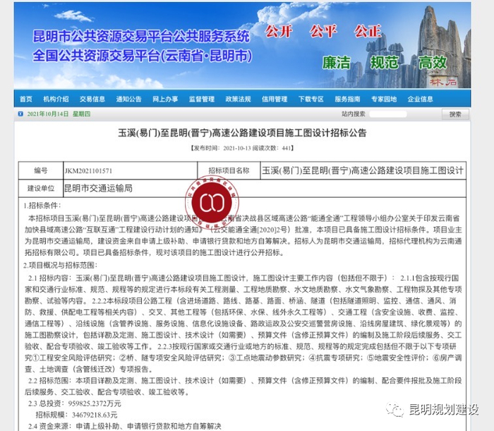 10月13日,昆明市交通运输局发布“玉溪(易门)至昆明(晋宁)高速公路建设项目施工图设计”公告,该项目总投资约96亿元,计划于11月15日开工,2026年12月31日竣工。