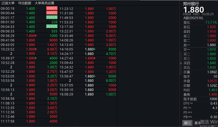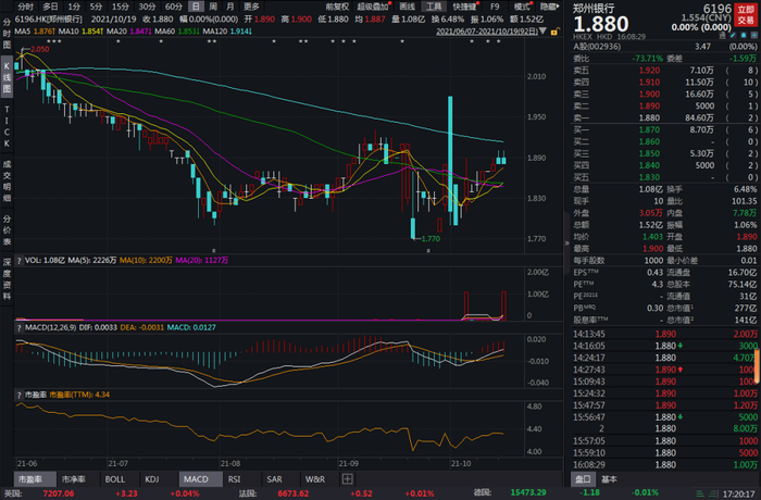 不过,在数分钟内交易量破1亿股,截至收盘,全天成交量1.08亿股,成交额1.52亿港元(折合人民币约1.25亿元),相比该股此前日均百万股成交大增近百倍。相比当日,郑州银行在A股总成交额约2750万元。