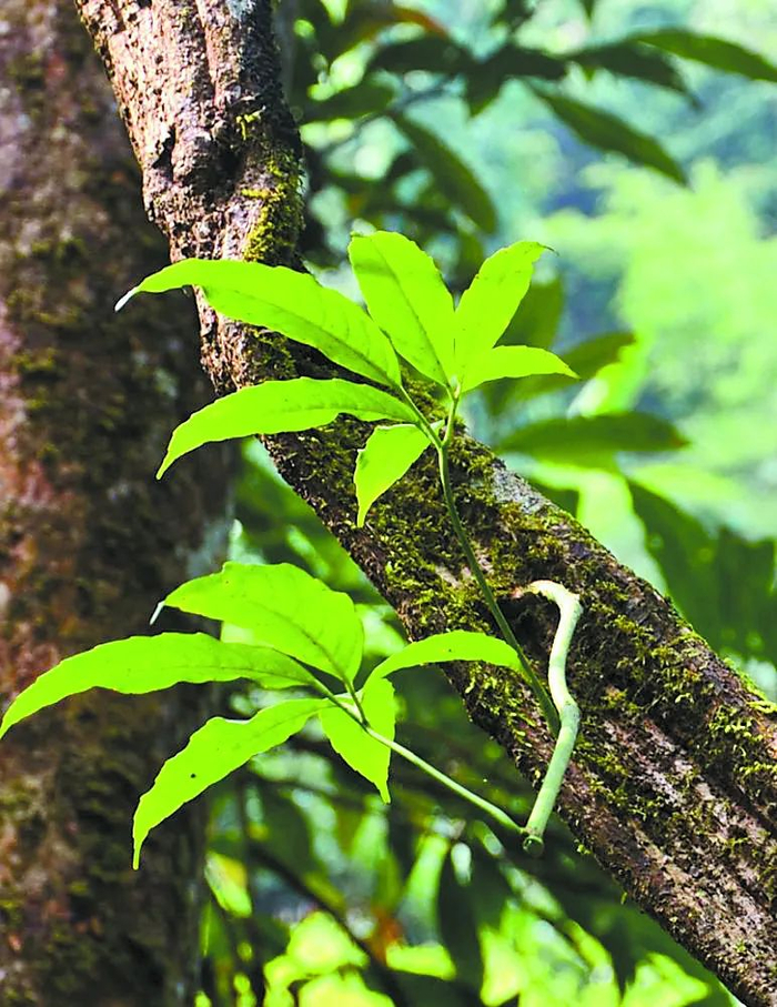 扁担藤长宽可达50多厘米,而厚度却仅在10厘米左右,在西双版纳热带雨林里,常见几十米长的扁担藤缠绕于乔木或山石之间,扁担藤是热带雨林中为数不多的具有老茎开花、老茎结果现象的藤本植物。它的花果都仅仅出现在较粗壮的藤茎基部,甚至贴地而生,不仅有利于各种昆虫为它传花授粉,也有利于动物采食它的果实,帮助它更远地传播种子。此外,如切断扁担藤茎,流出的汁液可饮用解渴。