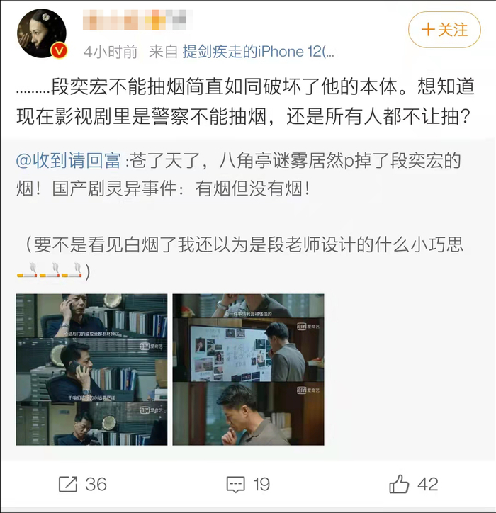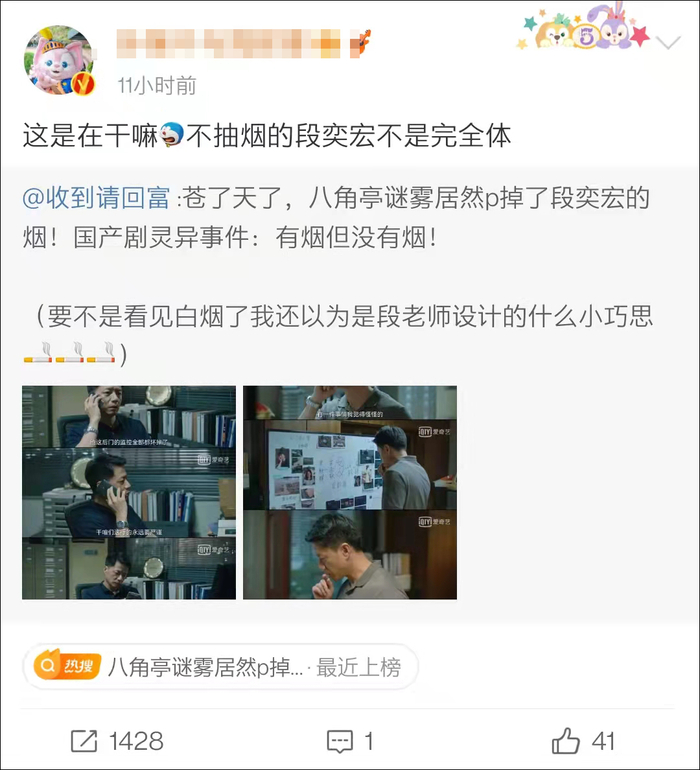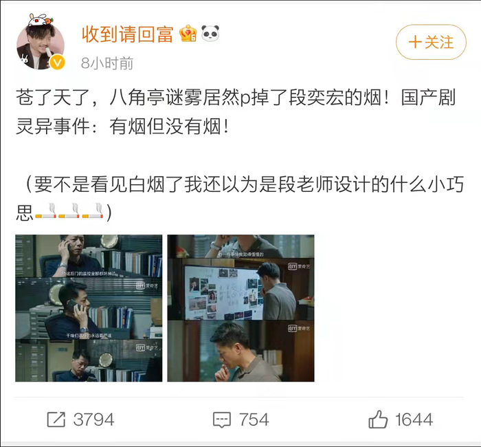 10月21日,微博网友@收到请回富 晒图吐槽近日热播的悬疑剧《八角亭迷雾》,该剧将演员段奕宏所饰演的角色吸烟镜头里的烟全部P掉,引发网络热议。